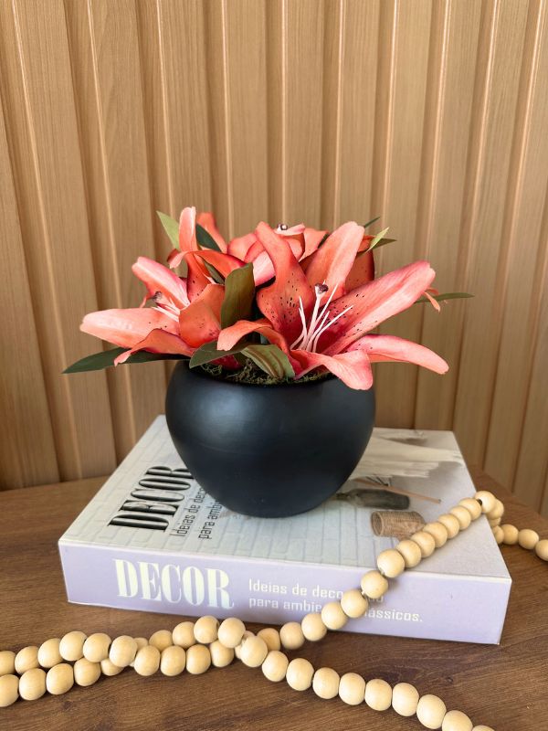ARRANJO DE LÍRIOS ROSA CORAL ARTIFICIAL VASO AQUARIO PRETO