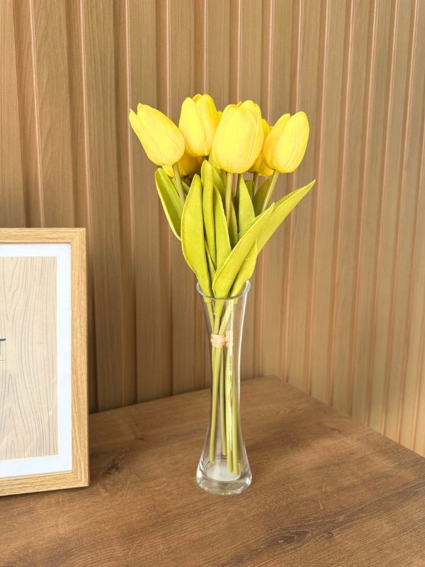 ARRANJO DE TULIPAS AMARELO ARTIFICIAL COM VASO DE VIDRO