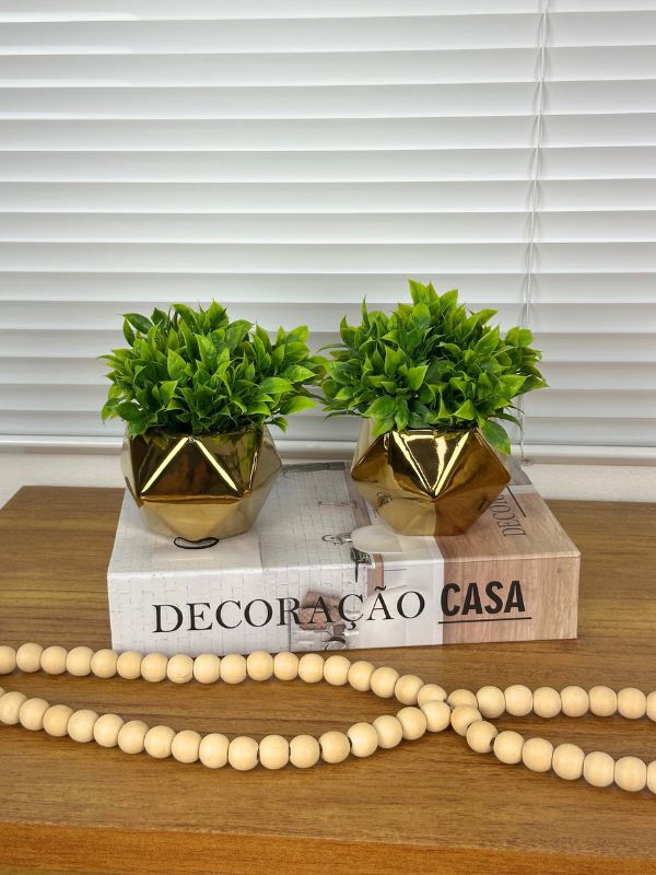 KIT 2 VASINHO CERÂMICA DOURADO COM VERDINHO