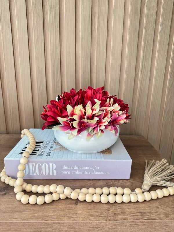 MINI LIRIOS ARTIFICAIS VERMELHO E AMARELO VASO CERAMICA BRANCO