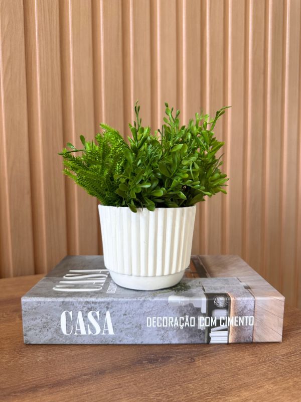 VASO PLISSADO CERÂMICA OFF WHITE COM VERDINHOS ARTITFICIAIS