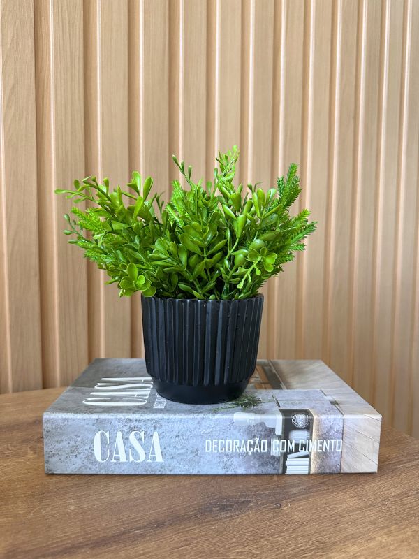 VASO PLISSADO CERÂMICA PRETO COM VERDINHOS ARTIFICIAIS