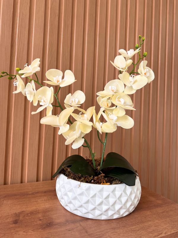 ARRANJO DE ORQUÍDEA ARTIFICIAL CREME 2 HASTES VASO CERÂMICA BRANCO G