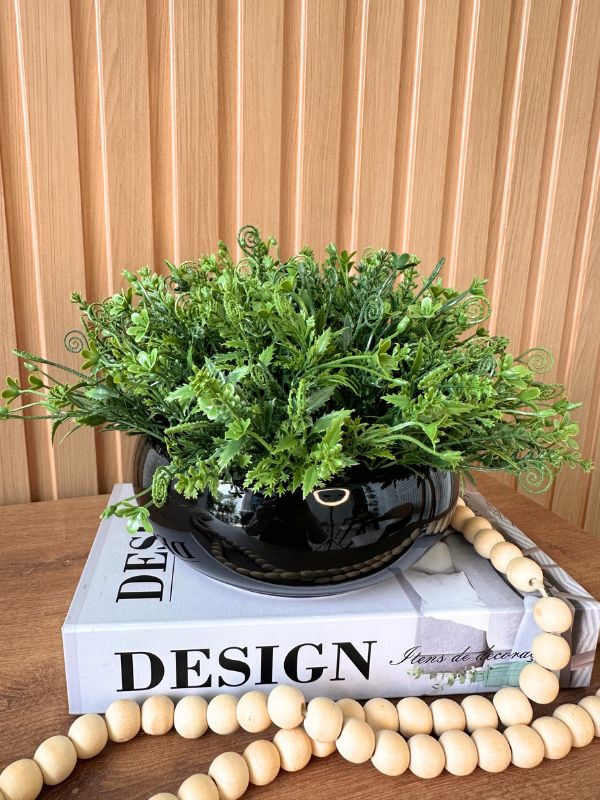 VASO CERAMICA PRETO BRILHO COM PICK VERDE ARTIFICIAL